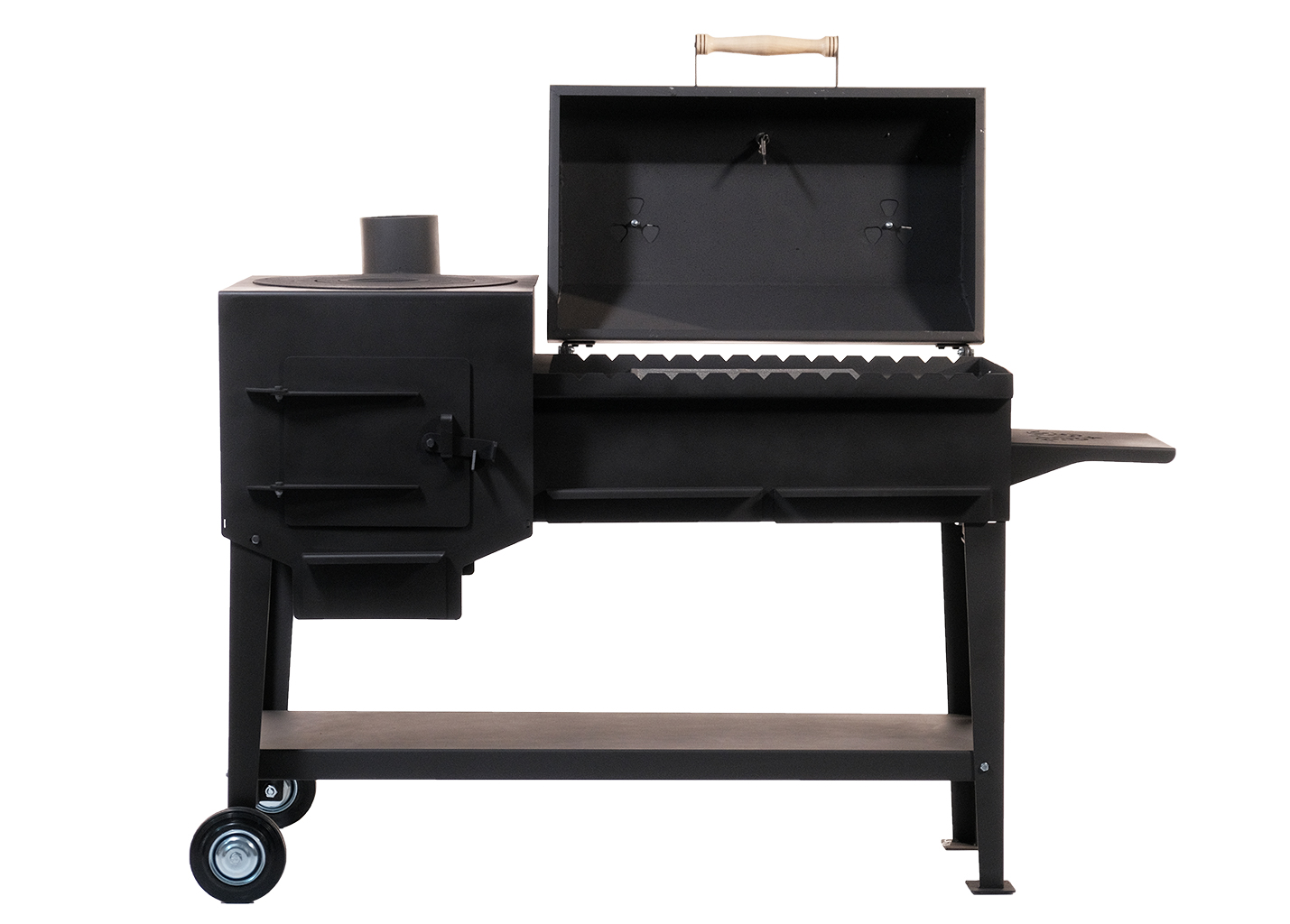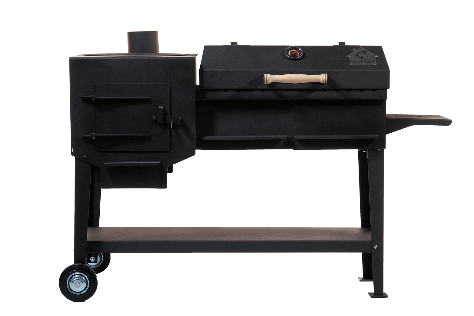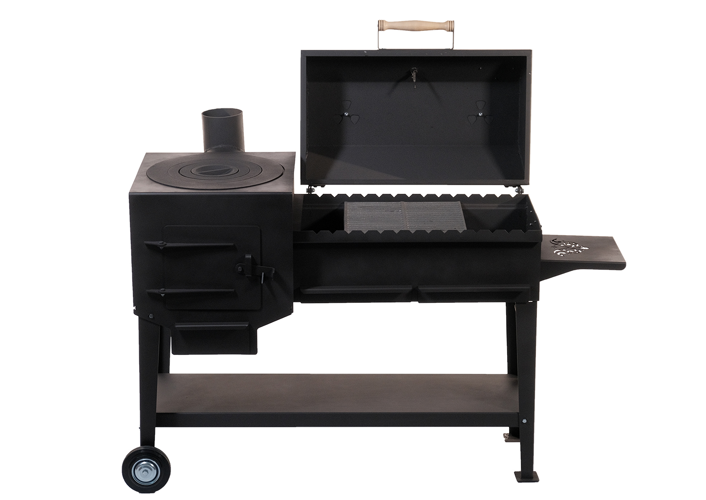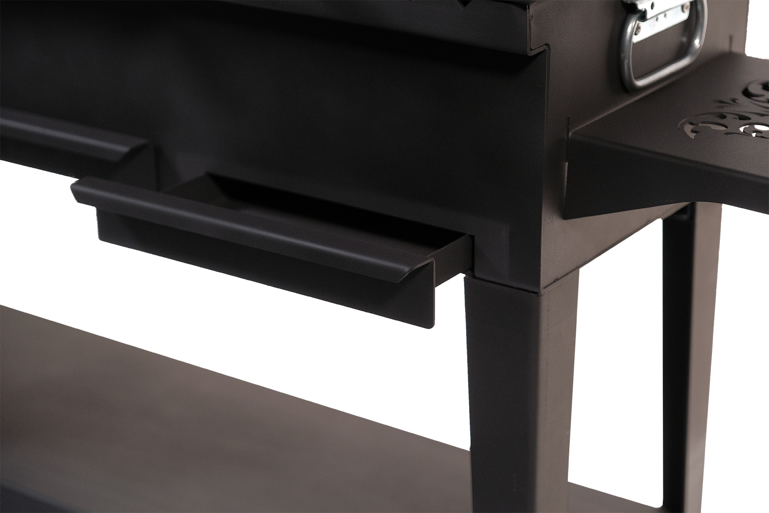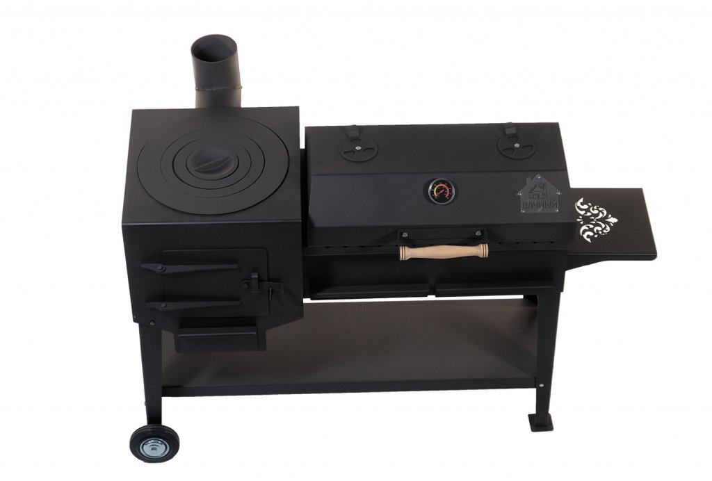 Зольный ящик разделен на 2 сегмента, что позволяет легко удалить продукты горения после использования данной модели, сохраняя чистоту на дачном участке, а также регулировать интенсивность горения как с одной, так и с другой половины. Удобные полки позволяют с комфортом разместить все необходимые аксессуары.