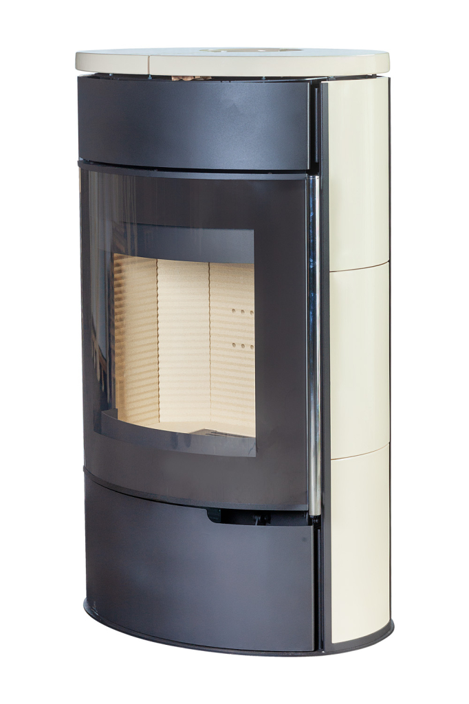 Камин украшен теплостойкой майоликой кремового цвета
