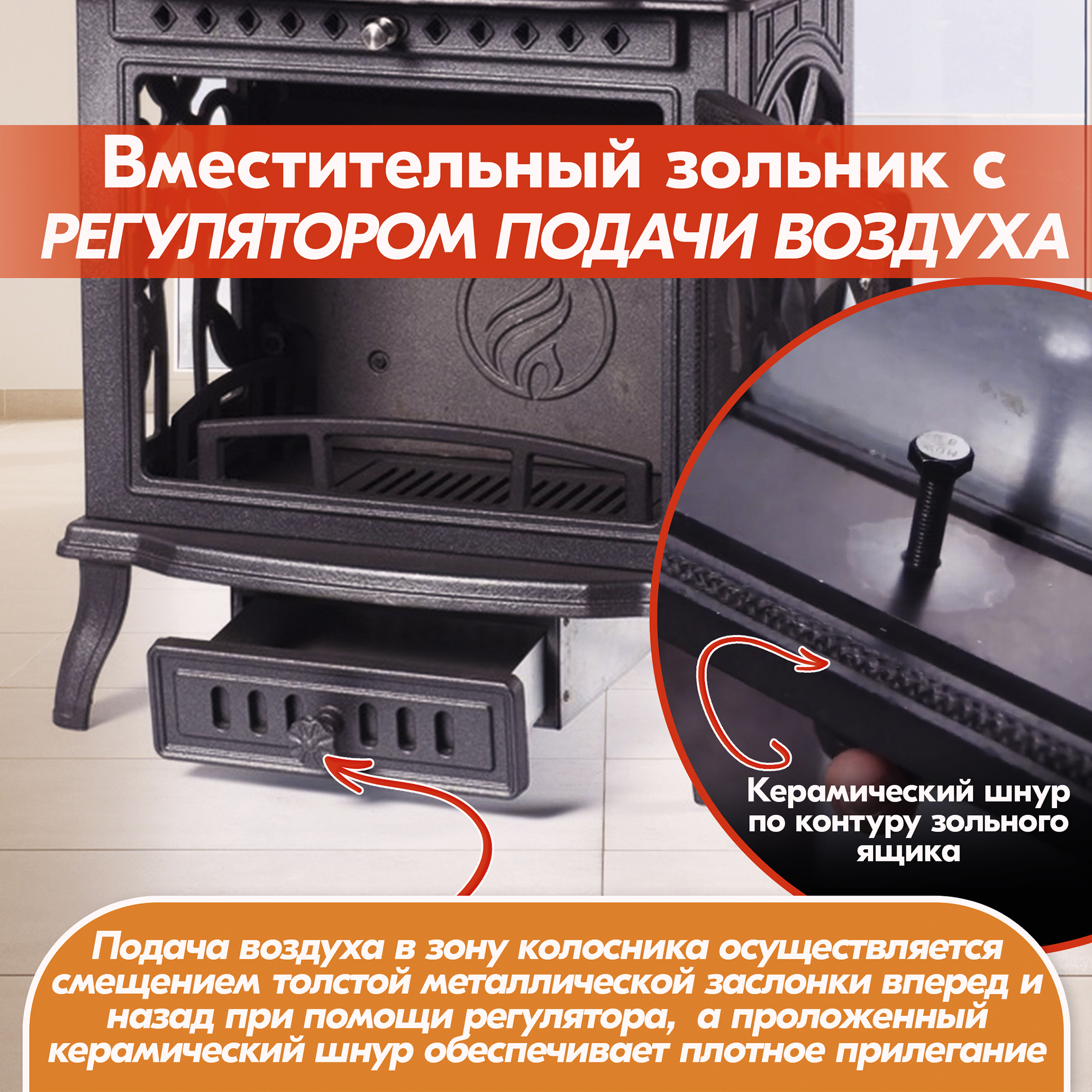 После достижения в помещении комфортной температуры рекомендуем переводить печь-камин в режим длительного горения, регулируя и уменьшая подачу воздуха при помощи регуляторов подачи воздуха.