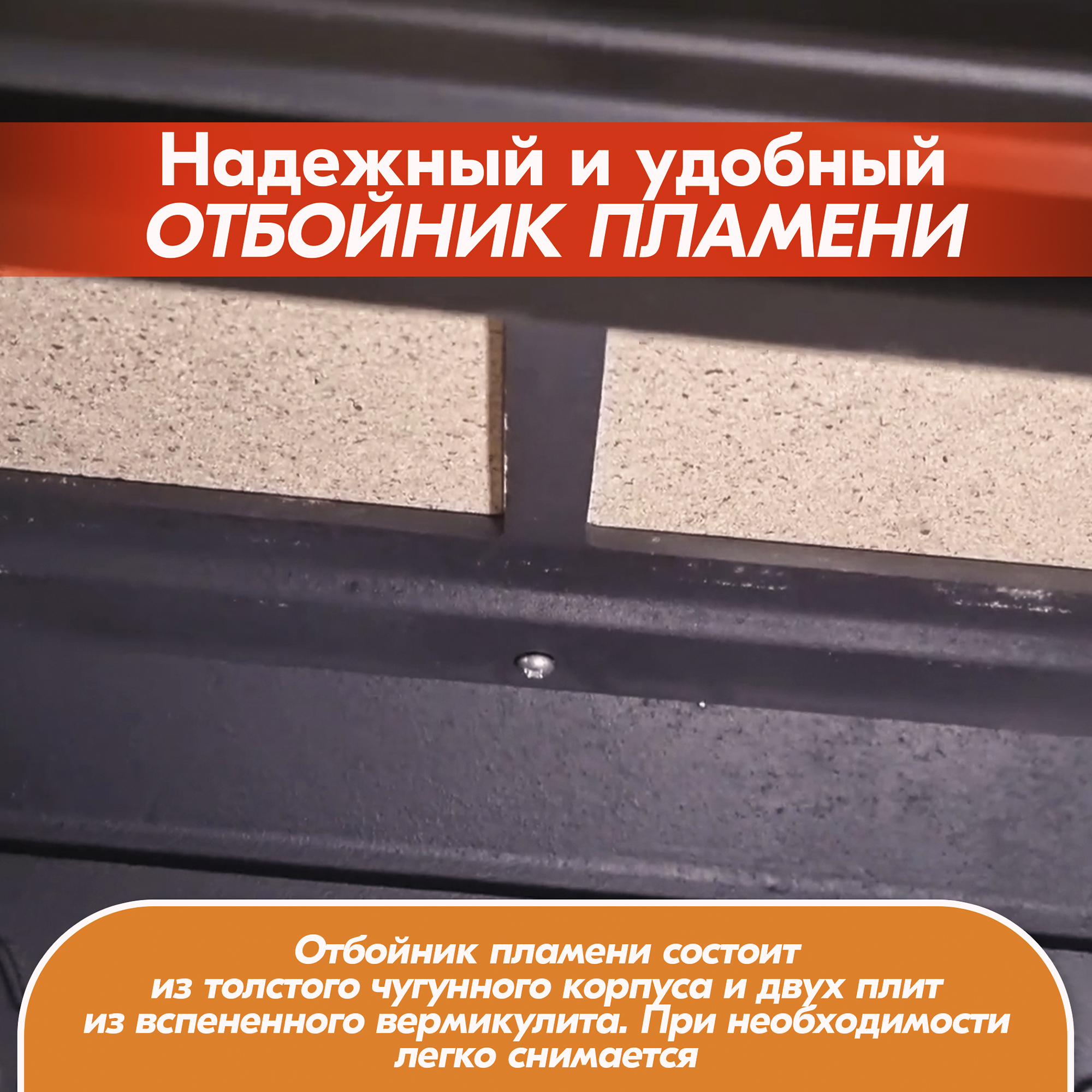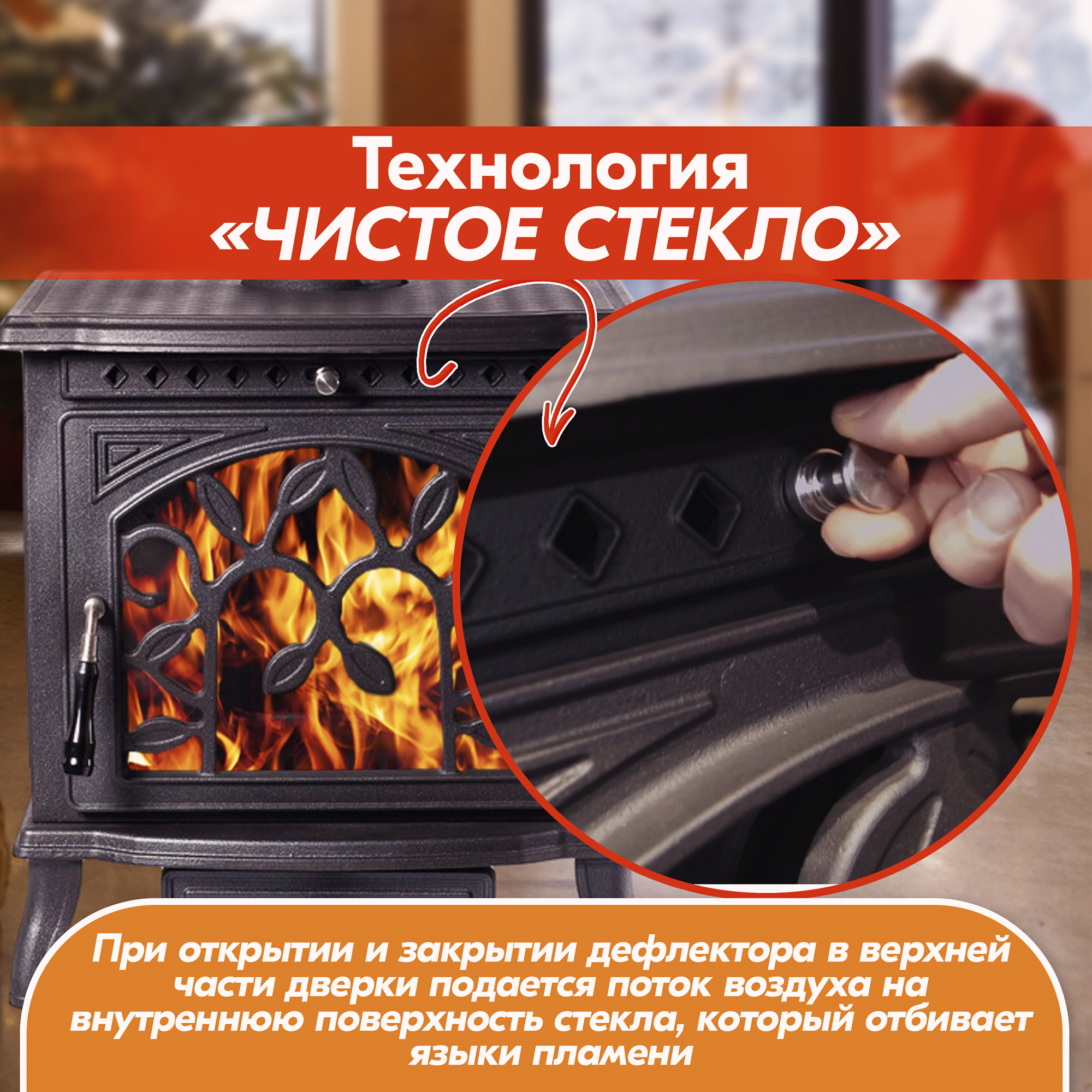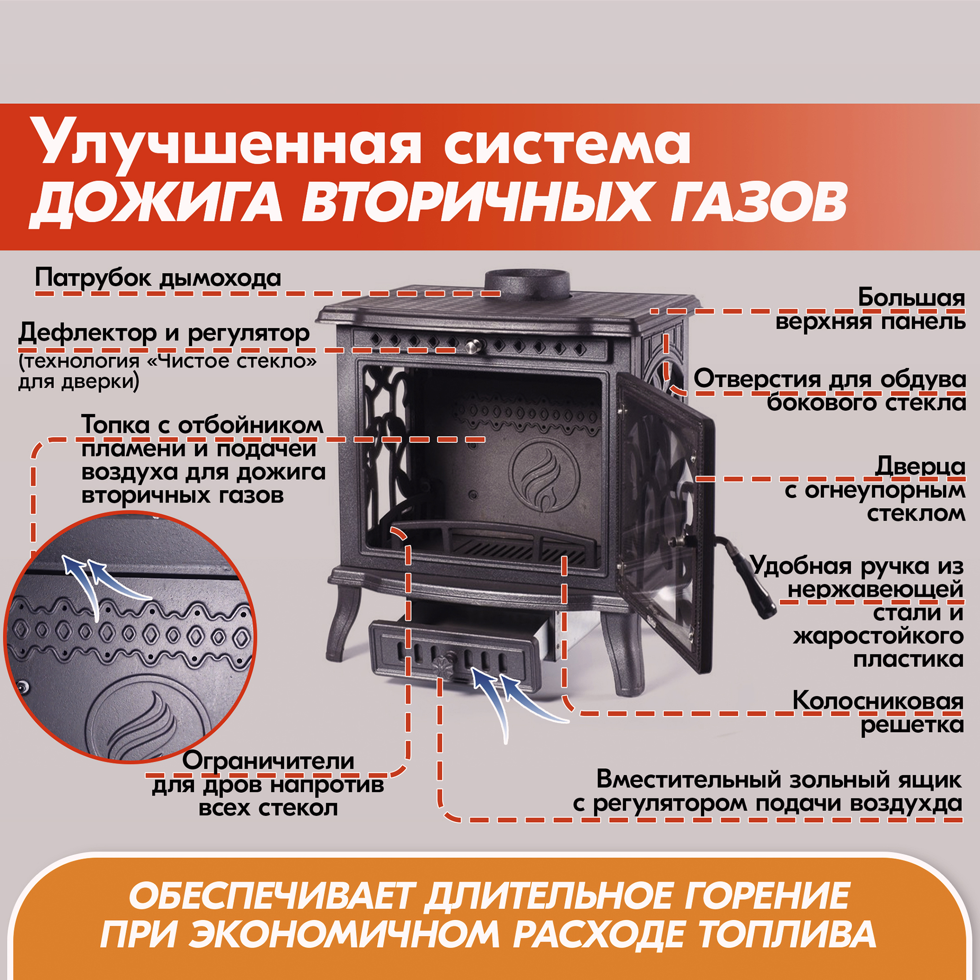 В конструкцию чугунной печи-камина внедрена система дожига вторичных газов, позволяющая достичь КПД камина в пределах 82%.
