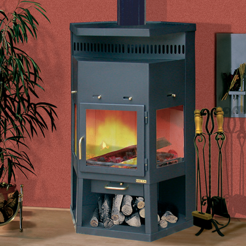Оборудована дверцей и фронтальными окнами, что позволяет наблюдать за огнем на 360 градусов.