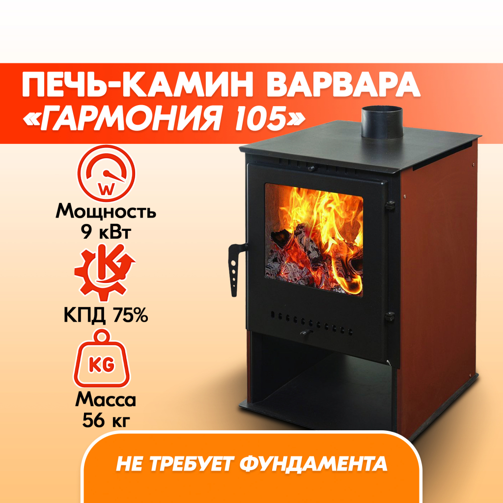 Печь-камин Варвара «Гармония 105» мощностью 9 кВт предназначена для отопления комнат или небольших домов объемом до 100 куб. м.