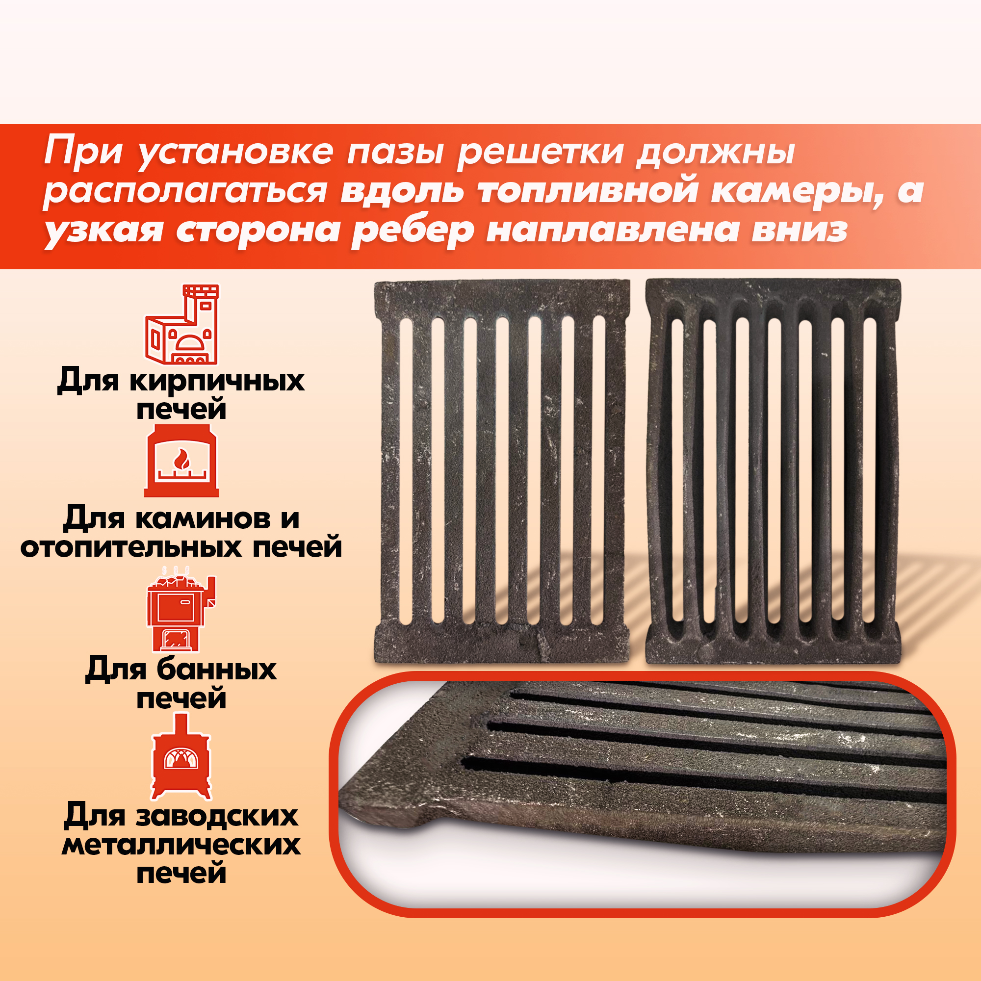 Обращаем внимание, что колосниковая решетка из чугуна РУ-7 — это 1/2 колосниковой решетки для угля РУ-2 и предназначена для укладки с решеткой РУ-2 в увеличенные по ширине топки печей размером 300х300 мм и больше.