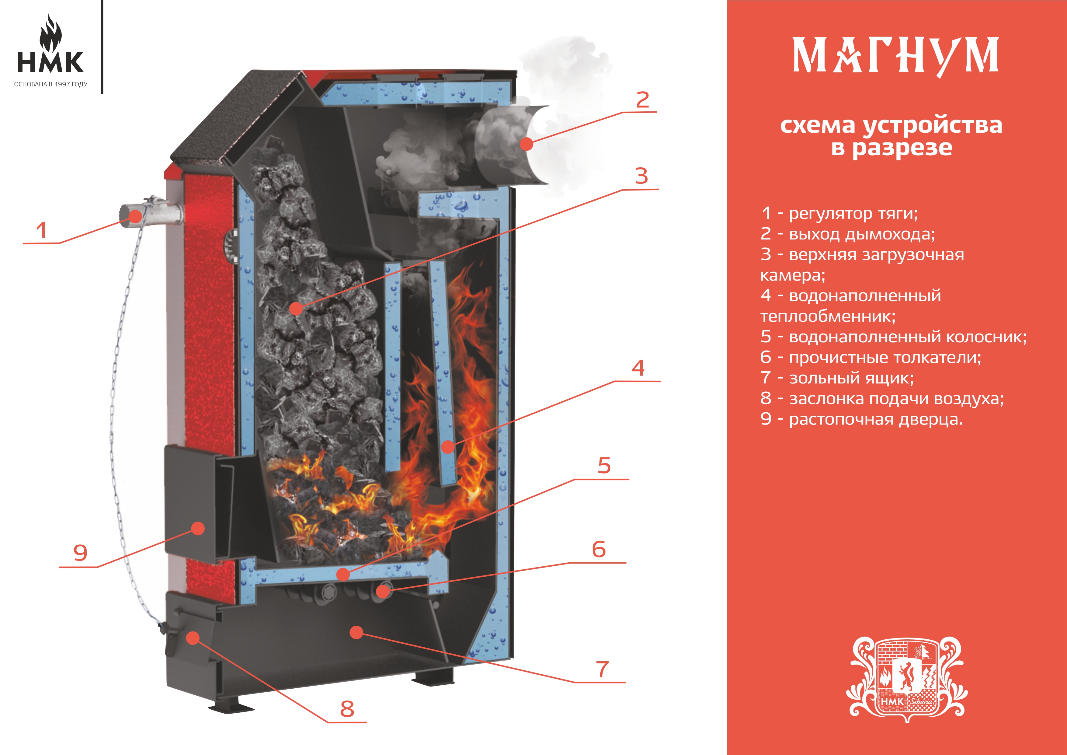 Принцип действия котла "Магнум" 15 кВт основан на передаче тепловой энергии, высвобождаемой при сжигании топлива теплоносителю - воде. В результате горения стенки, крышка и частично дно топки и поверхности труб нагреваются и передают тепло воде, циркулирующей в водяной рубашке и теплообменниках, которая выходит через патрубок подачи в верхней части котла. Вода-обратка попадает в котел через патрубок обратки в нижней части боковой стенки.